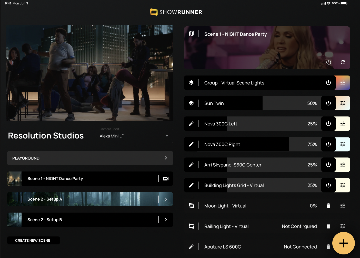 To help, SHOWRUNNER pipes the camera feed into the tablet or smartphone you're using to adjust the lights, allowing a gaffer or electrician to check the results in real time as they're adjusting lights—from the same app.